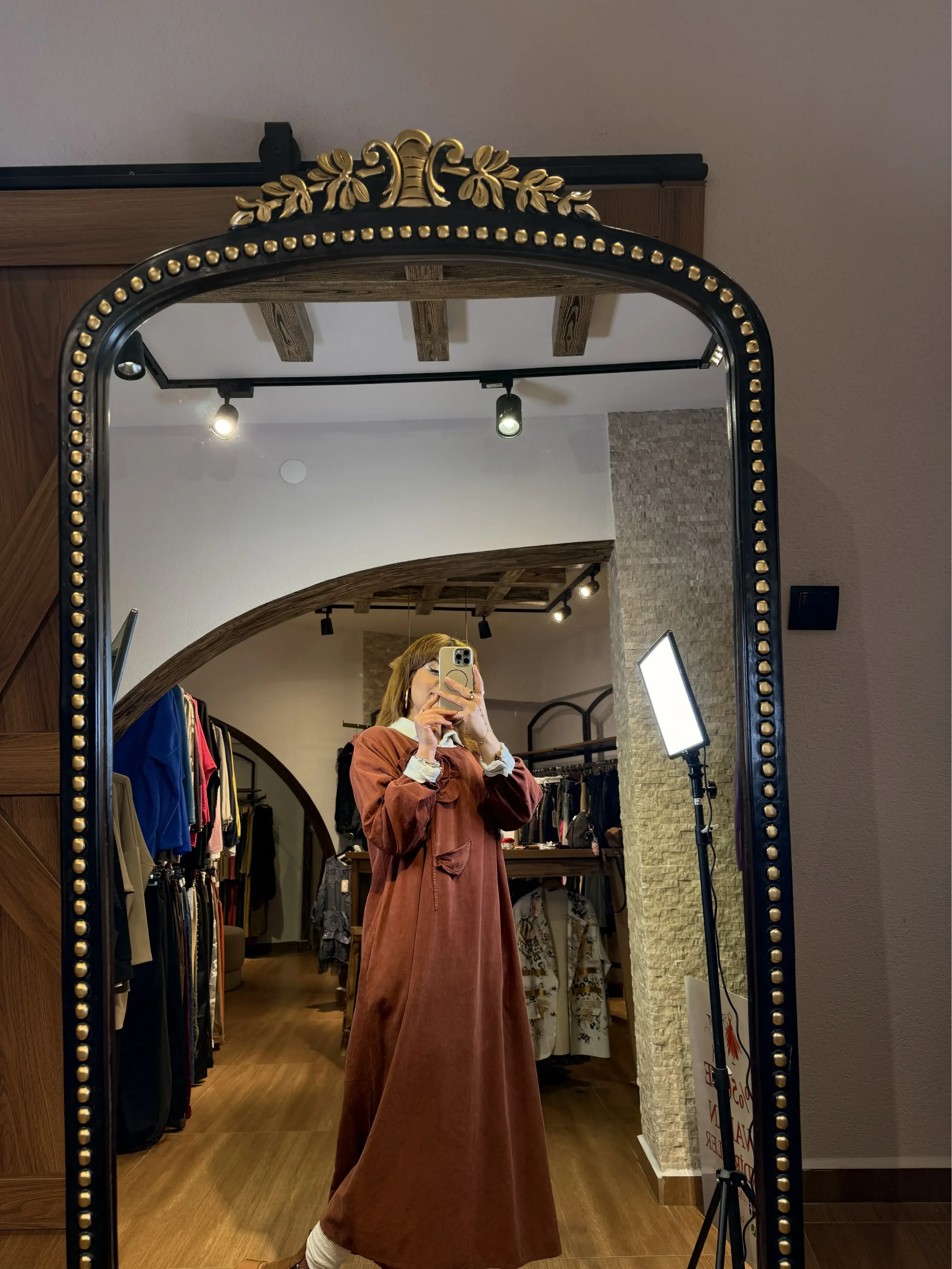 CAMENA GÜL VE CEP DETAYLI KADİFE ELBİSE KİREMİT